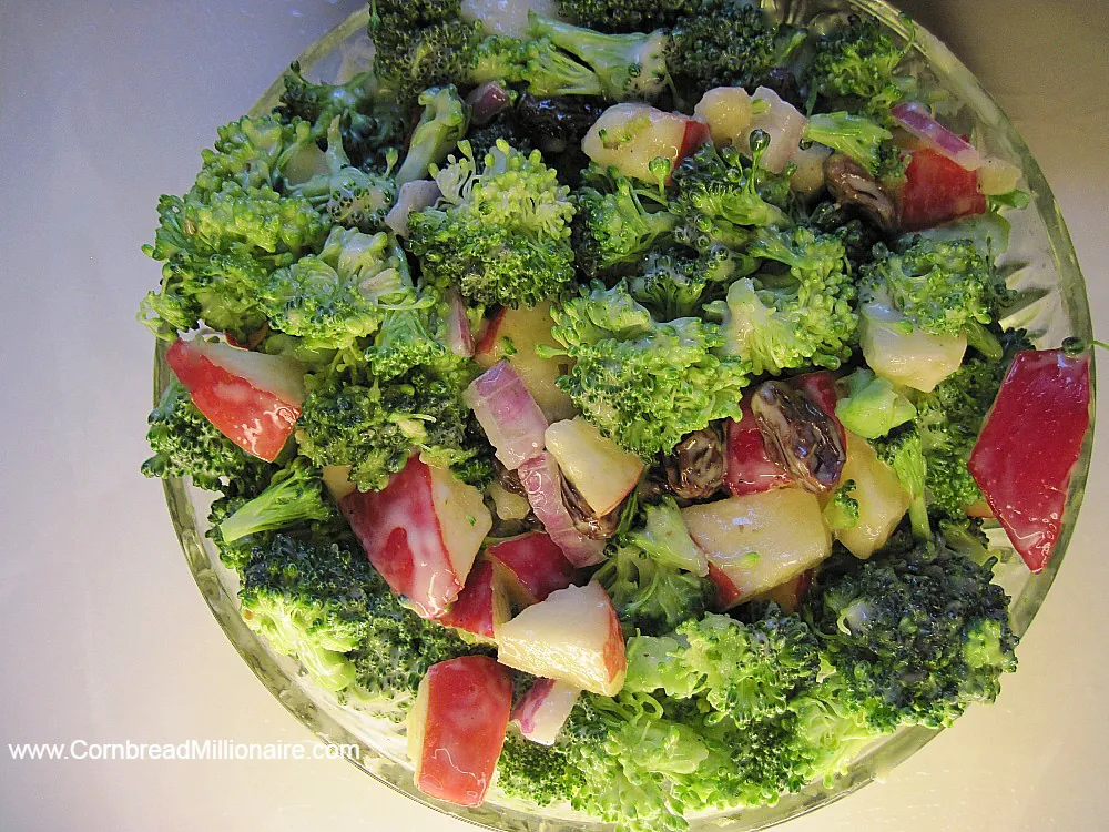 Broccoli Apple Salad, a refreshing cold side dish, contains fresh broccoli, raisins, and red onions drizzled with a creamy Homemade Salad Dressing.