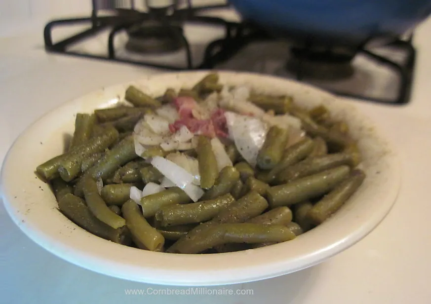 Southern Green Beans are packed with savory flavor.  Use this recipe when you need to make a quick and easy side dish to serve with barbecue or any meal.  Pairs well with a variety of mains. Recipe and photography by Beverly Davis for CornbreadMillionaire.com.