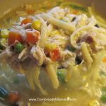Pour strained chicken broth back into pot. Add noodles, chopped chicken, frozen veggies and 1/2 teaspoon of Liquid Smoke.